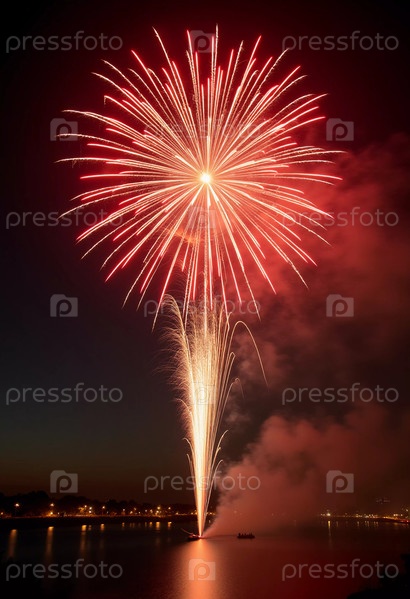 Яркие красные и золотые фейерверки взрываются на фоне темного неба, отражаясь в водном пути. Празднование освещает городской горизонт во время праздничного ночного мероприятия. Генеративный ИИ