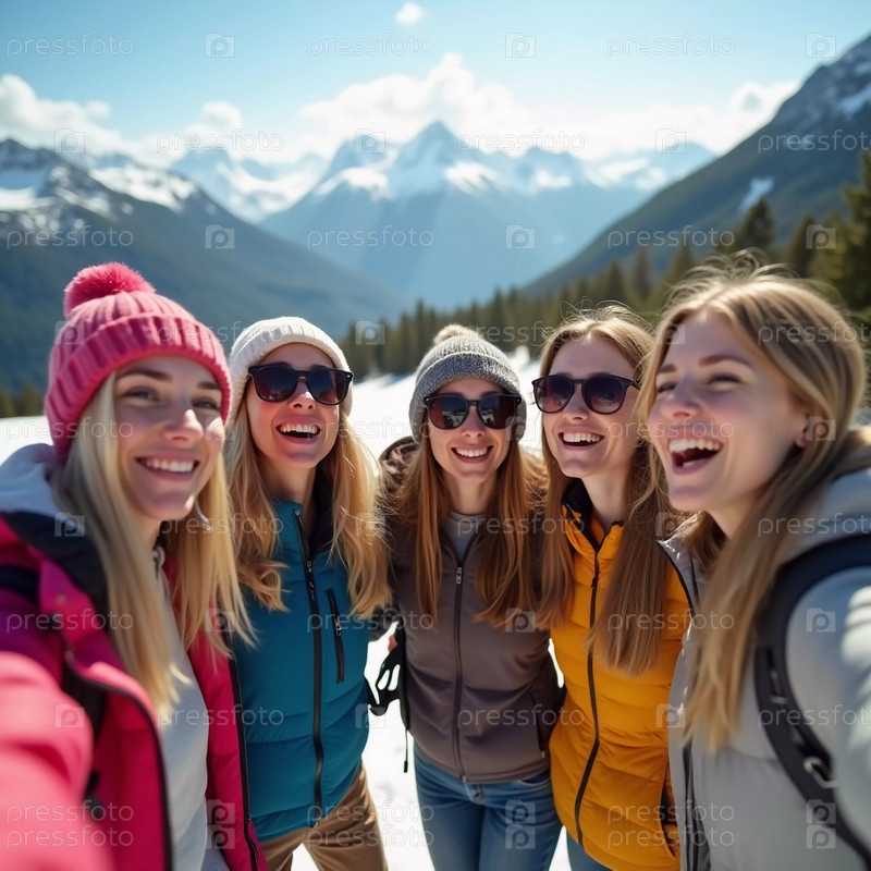 Пятеро друзей собираются на снегу, улыбаются и смеются, позируя для селфи. Яркое солнце светит над живописным горным ландшафтом, создавая радостную атмосферу во время лыжной прогулки. Генеративный ИИ
