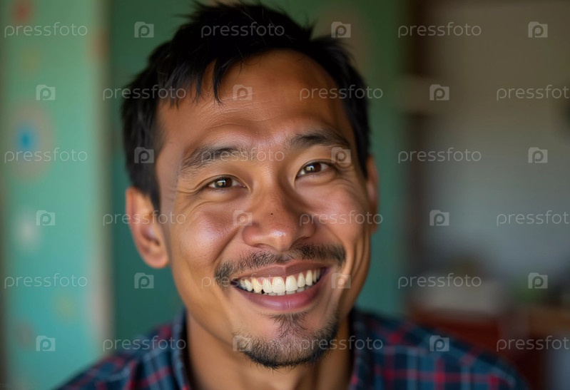 Веселый мужчина из Таиланда демонстрирует свою теплую улыбку в оживленной обстановке. Его счастье излучается, создавая гостеприимную атмосферу, наполненную позитивом. Генеративный ИИ