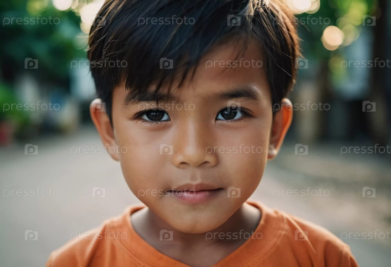 Мальчик, проживающий в Таиланде, играет на улице в солнечный полдень. Его яркая оранжевая рубашка подчеркивает его веселый дух и теплое выражение. Природное окружение дополняет радостную атмосферу. Генеративный ИИ