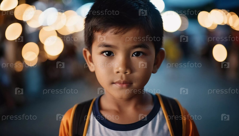 Молодой мальчик, проживающий в Таиланде, смотрит прямо в камеру со спокойным выражением лица. Он носит рюкзак и окружен оживленной атмосферой шумного ночного рынка с яркими огнями. Генеративный ИИ