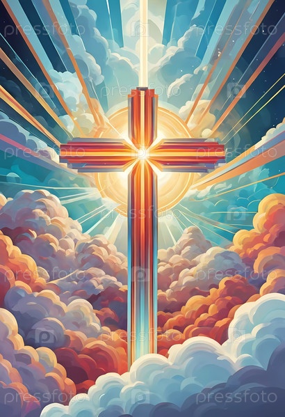Яркий крест возвышается среди разноцветных облаков, от которых исходят лучистые лучи света, создавая небесную атмосферу в безмятежный момент. Генеративный ИИ