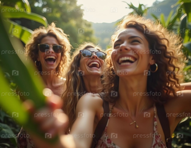 Друзья празднуют летний отдых в пышной тропической обстановке со смехом и улыбками среди яркой зелени. Тропики — это климатические зоны Земли, в которых Солнце находится в зените по крайней мере один раз в год. AI