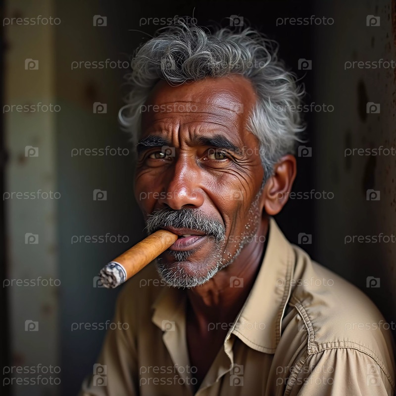 Пожилой мужчина с седыми волосами и густой бородой широко улыбается, держа сигару в зубах. Он отдыхает в своем районе на Кубе, наслаждаясь моментом. Генеративный ИИ