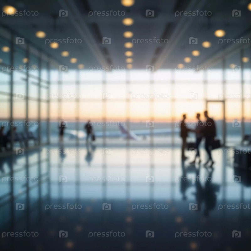 Толпы путешественников перемещаются по просторному терминалу аэропорта, занимаясь различными видами деятельности и готовясь к предстоящим рейсам в утреннем или вечернем свете. Расфокусированное боке. Генеративный ИИ