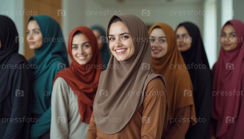 Разнообразная группа мусульманских женщин в красочных хиджабах уверенно стоит вместе. Они делятся улыбками и товариществом, наслаждаясь моментом единения и счастья. Красивые молодые женщины. Генеративный ИИ