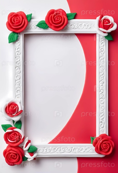 Яркая красно-белая декорированная рамка с розами окружает пустое пространство. Эта установка идеально подходит для демонстрации творческих проектов или специальных сообщений. Генеративный ИИ