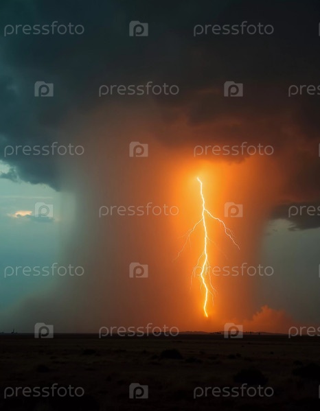 Яркие вспышки молний освещают темное небо, когда надвигается торнадо, бросая потустороннее сияние на ландшафт в сумерках. Генеративный ИИ