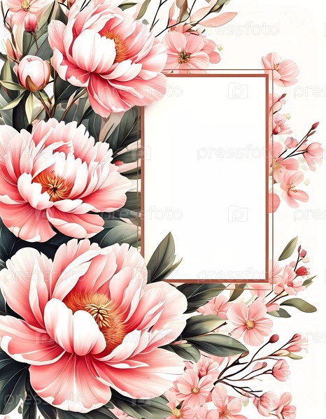 Красиво оформленная открытка с пышными розовыми пионами и нежными цветами, окружающими пустое место, идеально подходит для добавления личной записки или особого поздравления