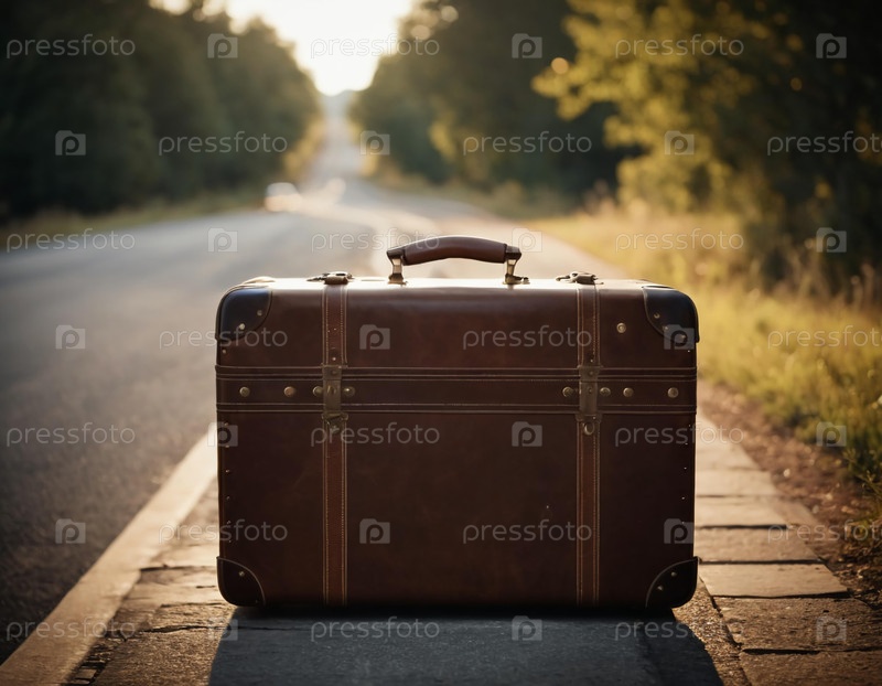 Потертый кожаный чемодан стоит на краю тихой дороги, купаясь в теплом сиянии заката. Он шепчет истории о приключениях и путешествиях, которые еще не начались