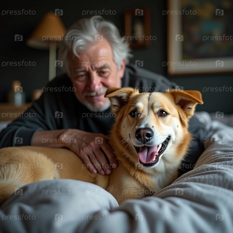 В уютной комнате, наполненной теплом, пожилой мужчина улыбается своей радостной собаке, отдыхающей рядом с ним на пушистой кровати, олицетворяя любовь, товарищество и радость совместных моментов. Генеративный искусственный интеллект