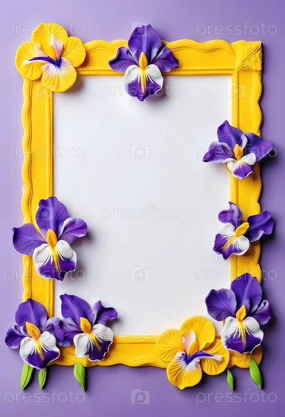 Прекрасная композиция из цветов ириса украшает ярко-желтую рамку на фиолетовом фоне, создавая потрясающий визуальный образ для художественного вдохновения и творчества