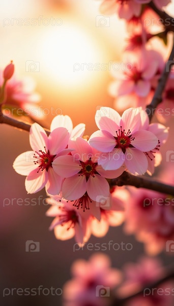 Нежные вишневые цветы цветут ярко, их нежно-розовые лепестки освещаются теплым сиянием солнечного весеннего утра. Солнечный свет проникает сквозь ветви, создавая волшебную атмосферу пробуждения природы. Сладкий аромат цветов наполняет воздух, приглашая к