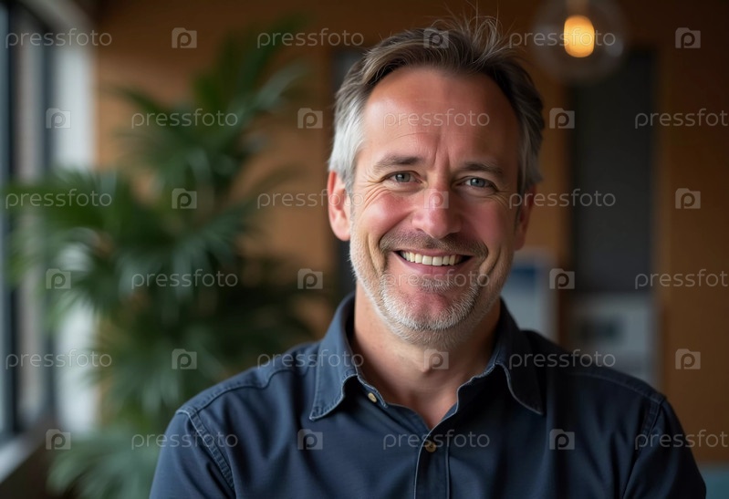 Веселый шведский мужчина излучает счастье в уютной обстановке. Окруженный нежной зеленью и теплым светом, он делится обаятельной улыбкой, которая невероятно озаряет атмосферу