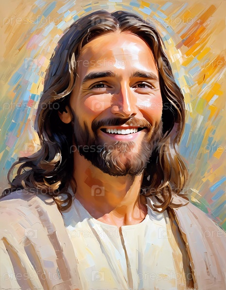Безмятежный портрет запечатлел Иисуса Христа с лучезарной улыбкой, окруженного красочным всплеском света. Его нежное выражение лица передает сострадание и надежду Генеративный ИИ