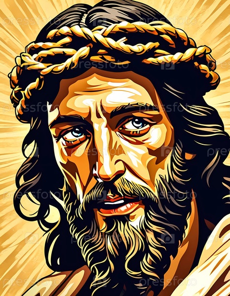 В мощном представлении безмятежная фигура Иисуса Христа смотрит задумчиво, освещенная золотой аурой, которая излучает тепло и мир. Искусство передает божественное сострадание Генеративный ИИ