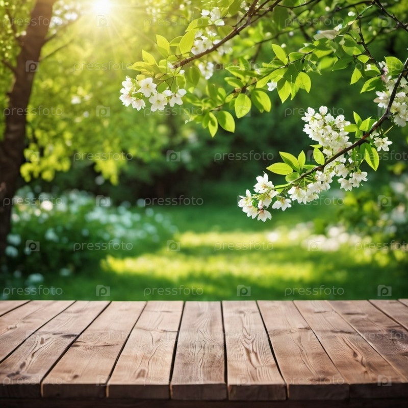 Деревянный стол стоит перед размытым фоном весеннего сада. Белые цветы на ветке тянутся к солнцу, которое светит сквозь листву. Копия пространства для демонстрации продукта. AI