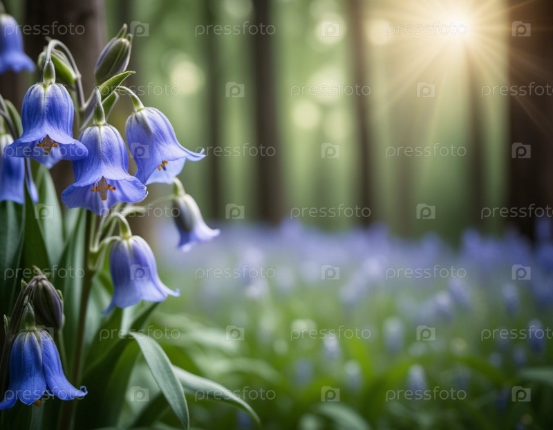 Цветы колокольчика цветут в пышном зеленом лесу. Светло-голубые лепестки цветов создают яркий контраст на фоне богатой листвы. Красивая природная сцена. Нечеткий фон. Глубина и спокойствие. AI