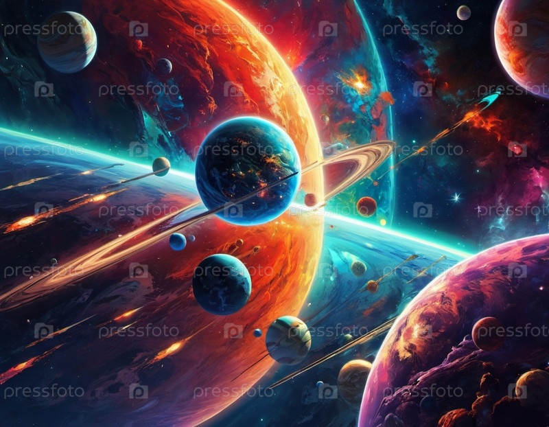Планетарная система с несколькими планетами, большим ярко окрашенным газовым гигантом и каменистой планетой. Яркие звезды и огромное пространство темного космоса с галактикой на заднем плане. Космические просторы. Космонавтика. ИИ