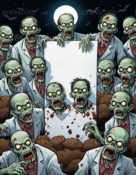 Большая группа зомби, чьи лица искажены выражением голода и разложения, держат пустой знак, их бледная, разлагающаяся кожа и пятна крови видны. Мертвые восстают на кладбище ночью. AI