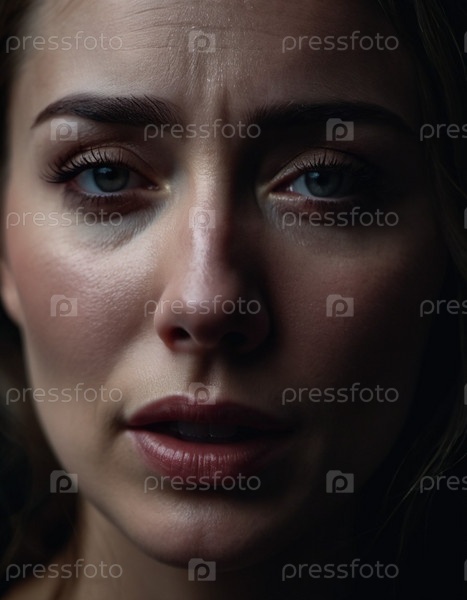 Женщина с нахмуренными бровями и обеспокоенным выражением лица смотрит прямо в камеру. Освещение тусклое, отбрасывает тени вокруг лица, подчеркивая ее стресс. Страх, разочарование, расстройство, беспокойство и задумчивость. ИИ
