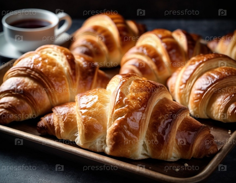 Ассорти из золотисто-коричневых круассанов на деревенском подносе. Теплый ароматный аромат наполняет уютную кухню. Привлекательная выкладка предполагает расслабляющую утреннюю встречу, идеальный завтрак-бранч с друзьями семьи