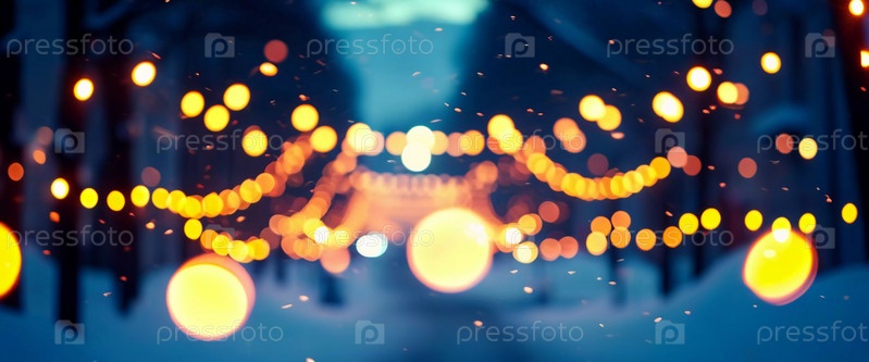 Зима приносит мягкий снегопад на городские улицы, где разноцветные огни висят над головой, создавая теплую и праздничную атмосферу. Эффект боке от огней добавляет причудливый штрих, подчеркивая радость сезона