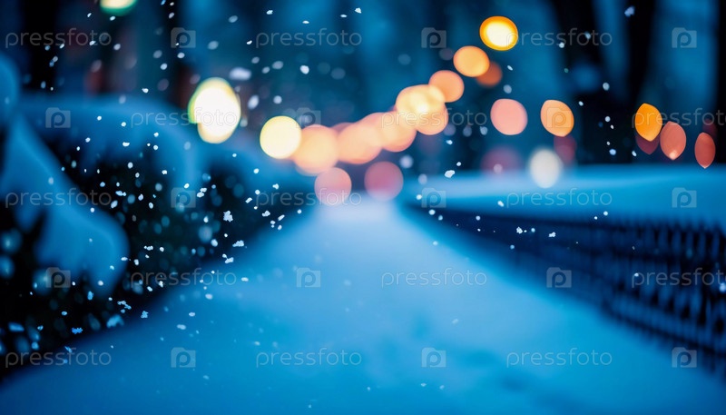 Зима приносит мягкий снегопад на городские улицы, где разноцветные огни висят над головой, создавая теплую и праздничную атмосферу. Эффект боке от огней добавляет причудливый штрих, подчеркивая радость сезона