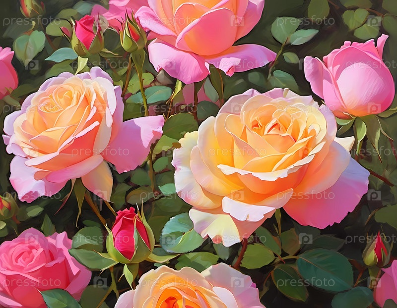 Яркая романтическая картина представляет собой пышную композицию из красиво цветущих роз разных оттенков, запечатлевшую сущность любви и природы в красочной обстановке сада при дневном свете. Генеративный ИИ