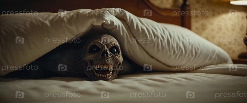 Ужасное кошмарное существо, таящееся под кроватью в тускло освещенной спальне, олицетворяющее сущность страха и неизвестности ночью. Гротескное существо с пугающими чертами тихо появляется из-под кровати. ИИ
