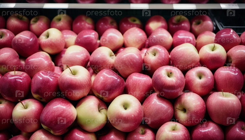 Разноцветный ассортимент розовых яблок аккуратно разложен на прилавке супермаркета, приглашая покупателей исследовать и выбирать свежие фрукты. Генеративный ИИ