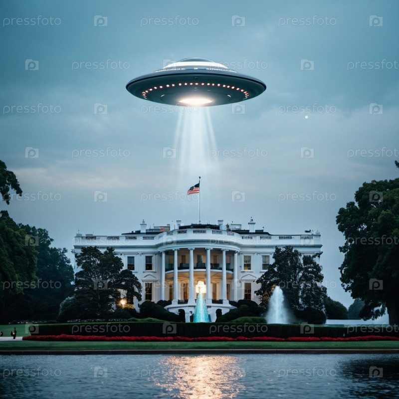 Неопознанный летающий объект парит над Белым домом, освещая территорию сфокусированным лучом света. Драматические облака обрамляют сцену. Генеративный ИИ