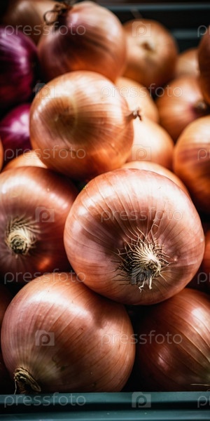 Разнообразные свежие крупные луковицы аккуратно разложены на прилавке супермаркета, демонстрируя свою блестящую коричневую кожуру и приглашая покупателей выбрать их для приготовления пищи или употребления в пищу. Генеративный ИИ