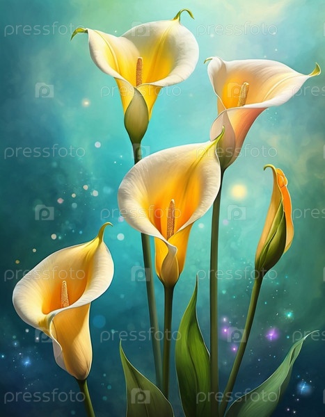 Гроздь изящных калл возвышается на фоне завораживающего красочного неба, демонстрируя свои изящные изгибы и мягкое свечение в сумеречный час. Генеративный ИИ
