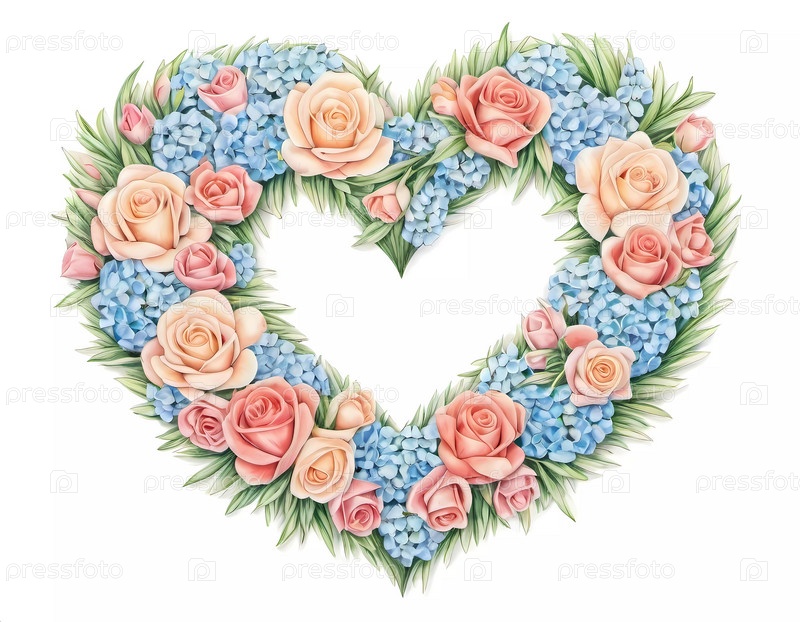 Цветочный венок в форме сердца представляет собой сочетание синих цветов и розовых роз, вызывая чувства любви, печали и сожаления, идеально подходит для Дня святого Валентина. Генеративный ИИ. Бежевый фон