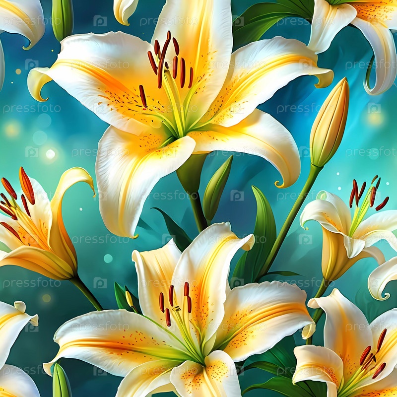Нежные белые, желтые, оранжевые лилии широко распускают лепестки, обрамленные светящимся сине-зеленым фоном, с мягкими бликами боке и теплыми солнечными лучами, создающими чарующую атмосферу. Генеративный ИИ