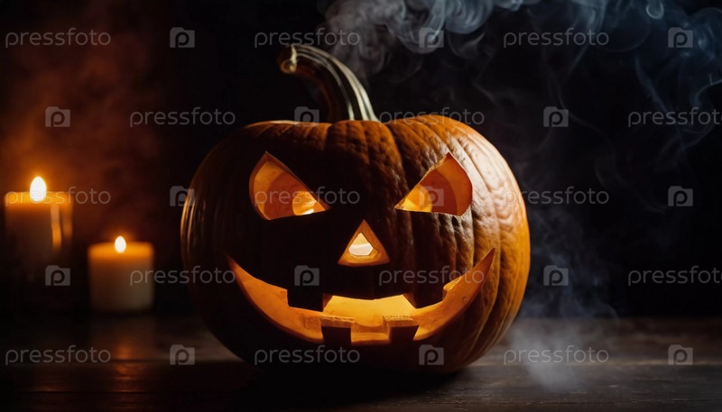 Вырезанная тыква на Хэллоуин имеет угрожающее лицо, подсвеченное изнутри, с дымом, поднимающимся вверх, что усиливает тревожную атмосферу вечера. Генеративный ИИ