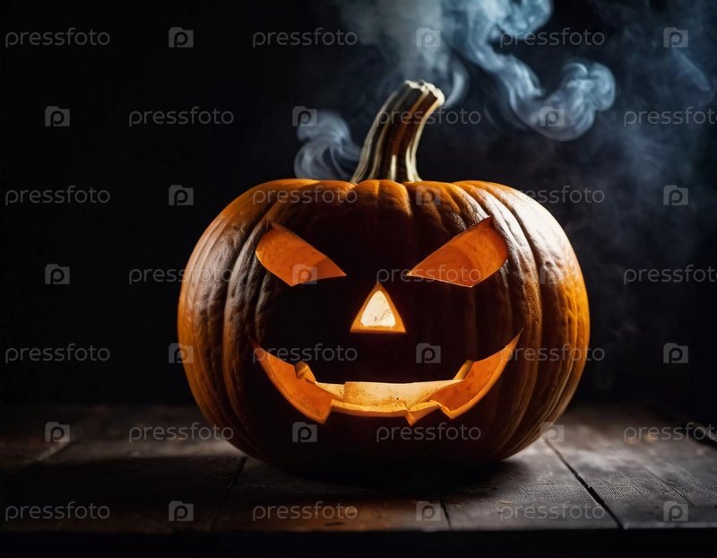 Вырезанная тыква на Хэллоуин имеет угрожающее лицо, подсвеченное изнутри, с дымом, поднимающимся вверх, что усиливает тревожную атмосферу вечера. Генеративный ИИ