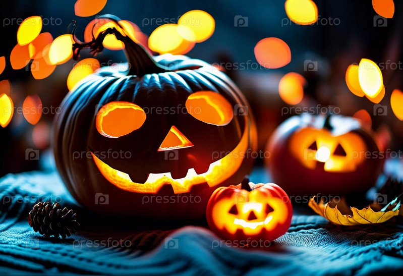 В этот Хэллоуин резная тыква излучает теплое свечение, окруженная маленькими тыквами и красочными осенними листьями, а на заднем плане мерцают праздничные огни. Генеративный ИИ