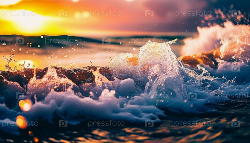 Когда солнце садится, морские волны разбиваются о берег, создавая красивый всплеск. Небо окрашено в теплые цвета, отражаясь на поверхности океана. Морской природный ландшафт. Генеративный ИИ