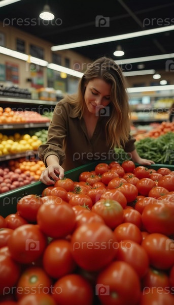 Женщина рассматривает спелый помидор в руке, задумчиво сравнивая его с другими на витрине в оживленном супермаркете, заполненном красочными фруктами и овощами. Генеративный ИИ. Покупатель в магазине