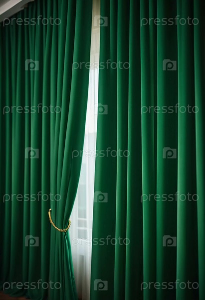 Штора с мягкими плавными струящимися складками. Глубокий зеленый цвет и роскошная фактура создают драматичную и элегантную атмосферу. Декор и дизайн интерьера. Дорогая штора из богатой ткани. AI