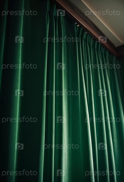 Штора с мягкими плавными струящимися складками. Глубокий зеленый цвет и роскошная фактура создают драматичную и элегантную атмосферу. Декор и дизайн интерьера. Дорогая штора из богатой ткани. AI