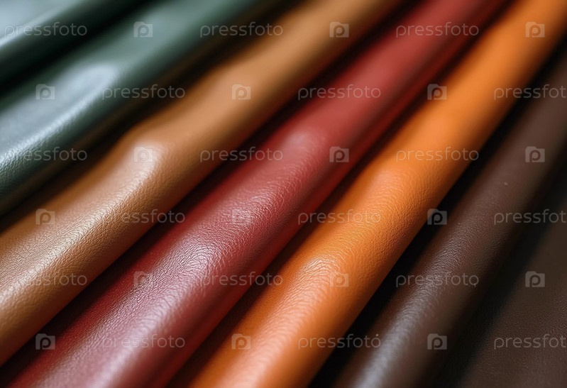 Образцы натуральной коровьей кожи разных цветов аккуратно разложены на поверхности, демонстрируя уникальные текстуры и качества каждого изделия. Эта коллекция подчеркивает мастерство. Генеративный ИИ