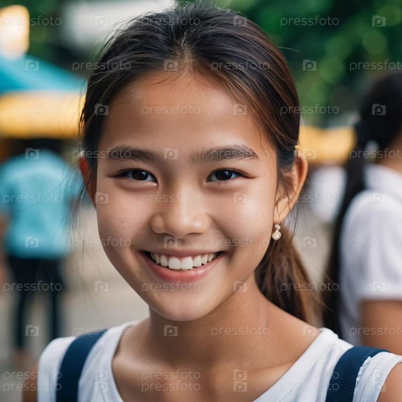 Веселая девушка выражает радость, демонстрируя яркую улыбку в Таиланде. Сцена передает ее расслабленную атмосферу на оживленном рынке, заполненном красочными прилавками и веселыми людьми. Генеративный ИИ