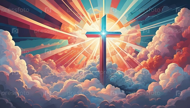 Яркий крест возвышается среди разноцветных облаков, от которых исходят лучистые лучи света, создавая небесную атмосферу в безмятежный момент. Генеративный ИИ
