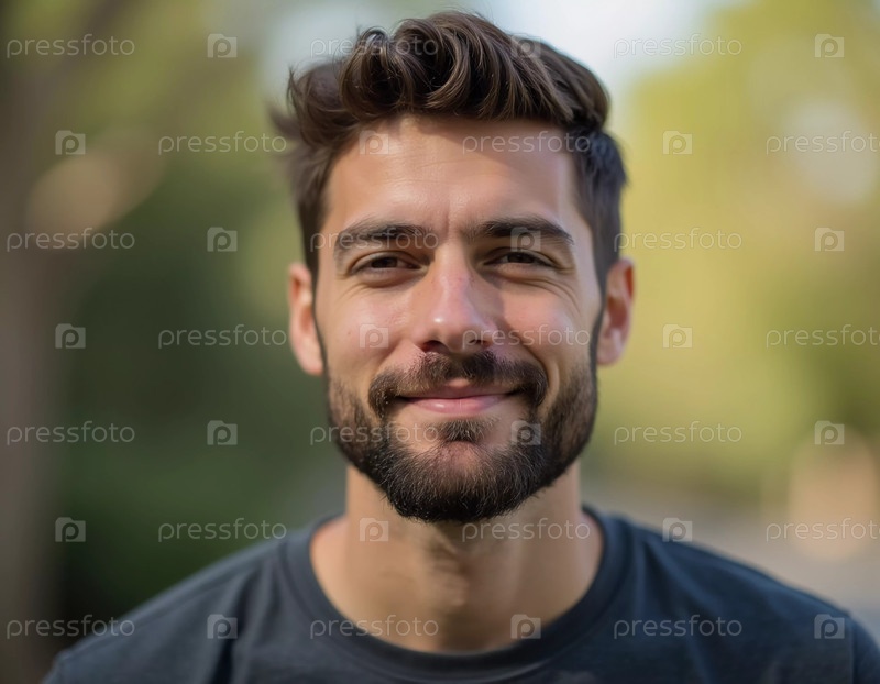 Веселый молодой симпатичный мужчина 30 лет, житель США, с короткими волосами и ухоженной бородой, тепло улыбается, одетый в повседневную одежду. Мягкое освещение усиливает дружескую атмосферу. Генеративный ИИ