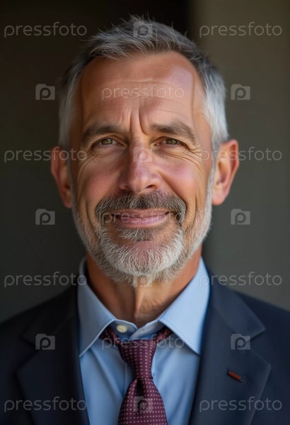 Зрелый мужчина с седыми волосами, житель США, нежно улыбается. Теплое освещение создает уютную атмосферу. Спокойный, уверенный взгляд. Опыт, профессионализм и интеллект в глазах. Генеративный ИИ
