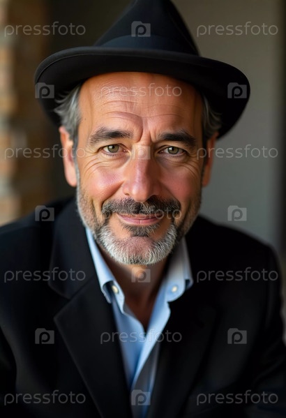 С лучезарной улыбкой этот местный мужчина воплощает дух Израиля. Одетый элегантно в черное пальто и стильную шляпу, он отражает богатое наследие и яркую атмосферу вокруг него AI