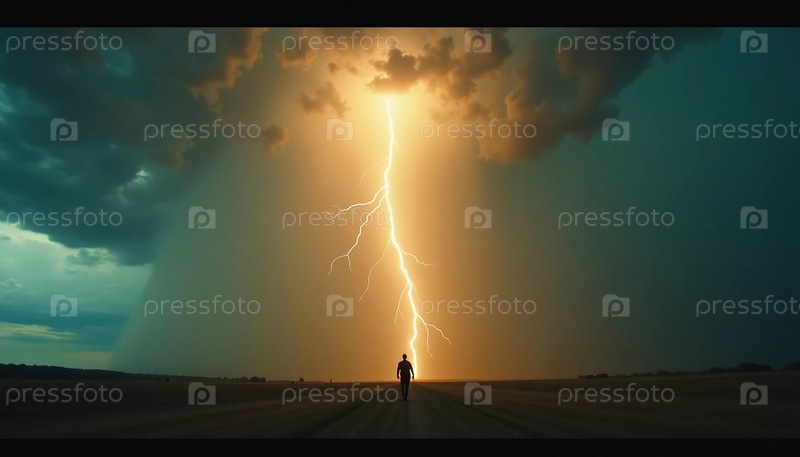 Одинокая фигура замирает в благоговении, когда яркая молния прорезает темные грозовые облака, освещая зловещую сцену надвигающегося торнадо на горизонте в сумерках. Генеративный ИИ